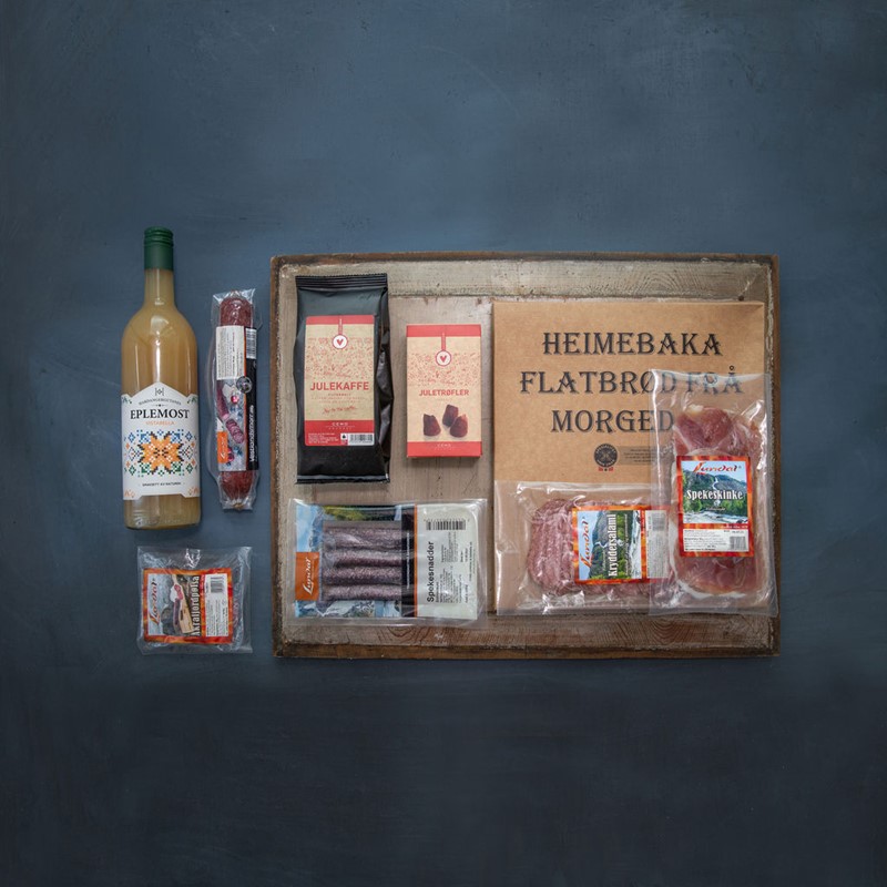 INNHALD: Eplemost, Julekaffi, Juletrøffler, Spekeskinke 100g, Kryddersalami 100g, Vestlandsmorr 200g, Spekesnadder, Heimalaga Flatbrød, Åkrafjordpølsa 80g.
