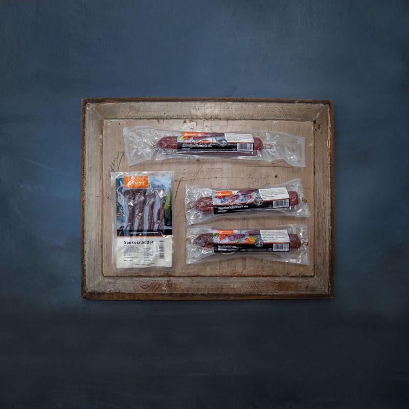 INNHALD: Åkrafjordpølsa 200g, Vestlandsmorr 200g, Italiano 200g, Spekesnadder 130g.